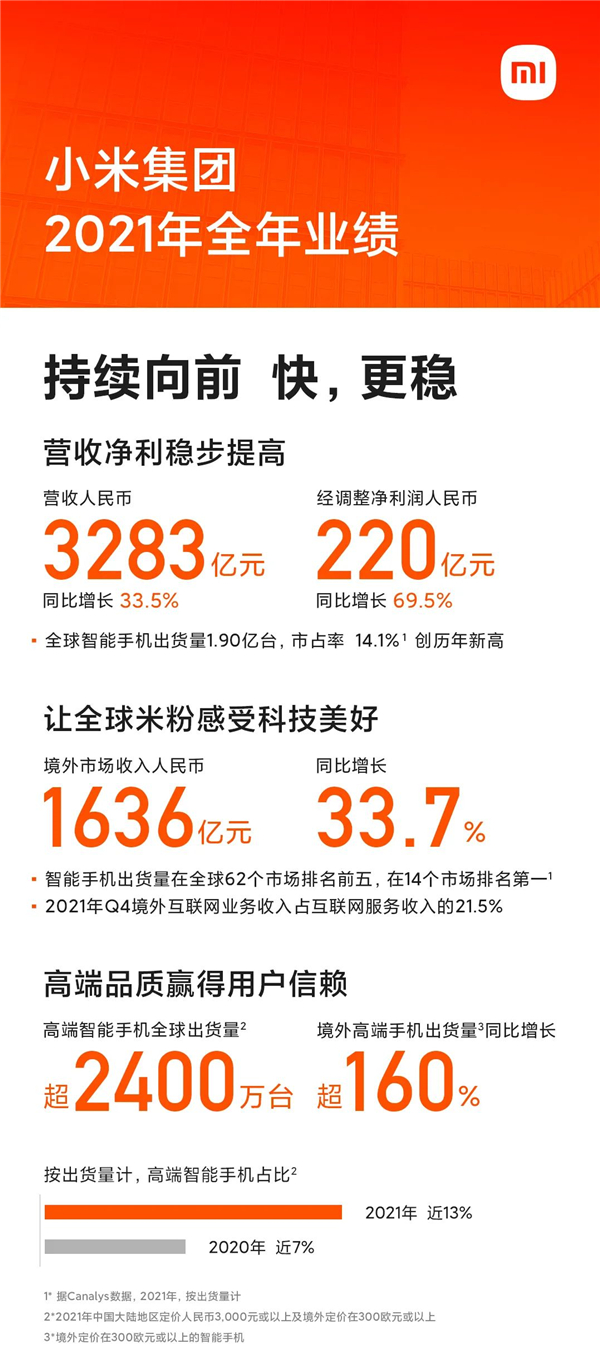 技術(shù)驅(qū)動手機(jī)×AIoT戰(zhàn)略優(yōu)勢進(jìn)一步擴(kuò)大。智能手機(jī)全球出貨量達(dá)1.9億臺,市占率14.1%,年出貨量和市場份額均創(chuàng)歷史新高。高端智能手機(jī)全球出貨量超過2400萬臺,實(shí)現(xiàn)翻倍增長。IoT重點(diǎn)品類發(fā)展勢頭強(qiáng)勁,小米電視連續(xù)3年中國第一,全球前五;小米智能空調(diào)全球出貨量超200萬臺,同比增長超70%。