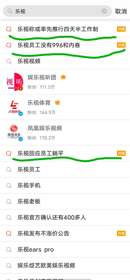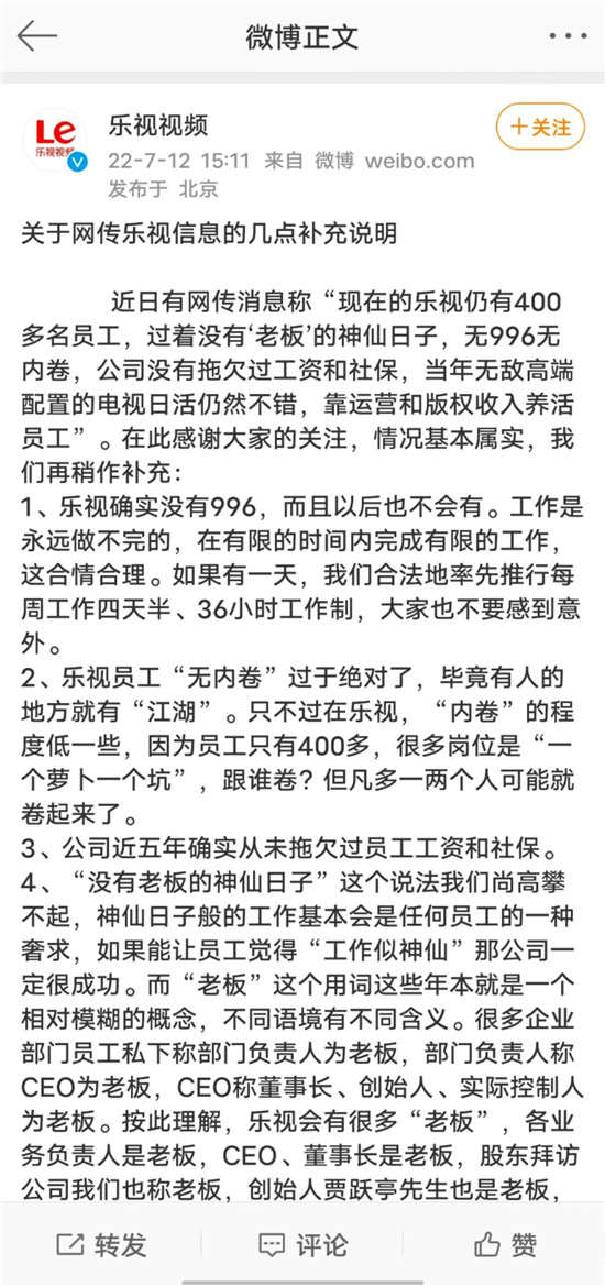 當(dāng)天下午,樂(lè)視就憑借這條回應(yīng)登上了微博的熱搜,分別是:#樂(lè)視回應(yīng)員工躺平#和#樂(lè)視員工沒(méi)有996和內(nèi)卷#,而在7月13日,#樂(lè)視稱(chēng)或率先推行四天半工作制#。