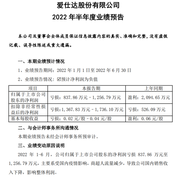 愛(ài)仕達(dá)發(fā)布2022年半年度業(yè)績(jī)預(yù)告,報(bào)告期內(nèi)歸屬于上市公司股東的凈利潤(rùn)虧損837.86萬(wàn)元–1,256.79萬(wàn)元,較上年同期由盈轉(zhuǎn)虧,同比變動(dòng)-160.00%至-140.00%。主要系受國(guó)內(nèi)疫情影響,商超人流量減少,導(dǎo)致公司國(guó)內(nèi)銷售收入下降,影響整體利潤(rùn)。