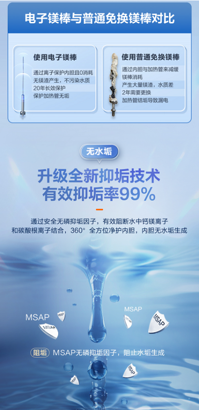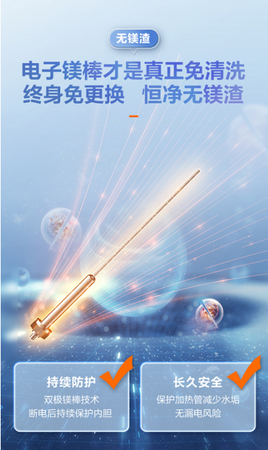 眾所周知,電熱水器通常采用鎂棒進行防腐,然而,傳統(tǒng)鎂棒一般2年左右就需要更換一次,尤其是在部分水質(zhì)較差的地區(qū)鎂棒表面容易鈍化,被大量鎂渣污水包裹無法保護內(nèi)膽導(dǎo)致漏水,不僅污染水質(zhì),影響人們的健康沐浴生活,還容易引發(fā)安全隱患。