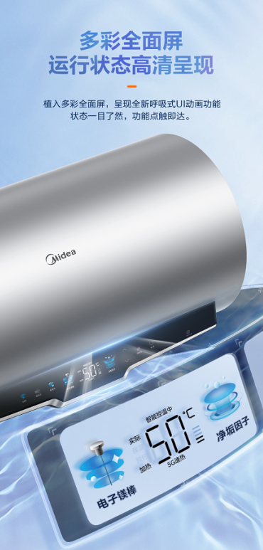 不僅如此,美的恒凈電熱水器TF7還擁有高顏值外觀設(shè)計和便捷的智能化操控體驗。外觀上,它采用榭湖銀配色,優(yōu)雅而大氣,多彩全面顯示屏呈現(xiàn)全新呼吸式UI動畫動能,水溫及工作狀態(tài),一目了然。