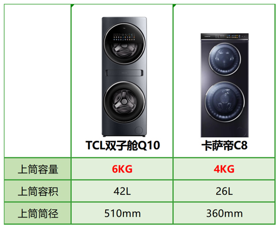 一臺洗衣機最重要的莫過于洗滌容量,這也是所有消費者對于洗衣機的基本要求。根據(jù)TCL公布的數(shù)據(jù),TCL雙子艙Q10的總洗滌容量是16kg,其中上筒容量是6kg,創(chuàng)造了行業(yè)最高記錄。而卡薩帝C8總洗滌容量是14kg,上筒容量只有4kg。