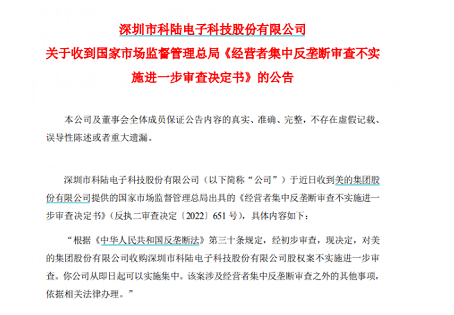 根據(jù)公告,公司于近日收到美的集團股份有限公司提供的國家市場監(jiān)督管理總局出具的《經(jīng)營者集中反壟斷審查不實施進一步審查決定書》,具體內(nèi)容如下: