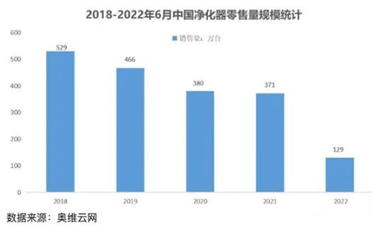 據(jù)奧維云網(wǎng)數(shù)據(jù)顯示,2022年上半年空氣凈化器零售額為21.3億元,同比增加24%,零售量為129萬臺,同比下降29%。事實上,從2018年開始,空氣凈化器的銷售額便出現(xiàn)斷崖式下跌,截止到2022年6月份空氣凈化器產(chǎn)品的跌勢并沒有停止。從目前來看,空氣凈化器市場規(guī)模已處于歷史低位。