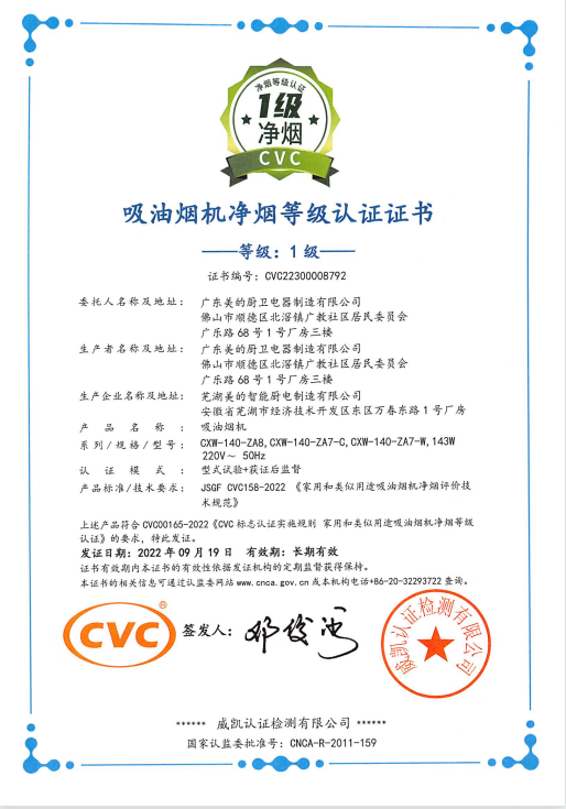 美的ZA8無煙感煙機(jī),通過模擬廚房實(shí)驗(yàn)室進(jìn)行的專業(yè)標(biāo)準(zhǔn)檢測證明,其廚房油煙顆粒物濃度PM2.5指數(shù)在38ug/m3,優(yōu)于一級凈煙50ug/m3的上限值,符合JSGF CVC158-2022《家用和類似用途吸油煙機(jī)凈煙評價(jià)技術(shù)規(guī)范》的要求,遠(yuǎn)超權(quán)威認(rèn)證機(jī)構(gòu)一級凈煙標(biāo)準(zhǔn),因此榮獲一級凈煙認(rèn)證證書,同時(shí)也證明了美的ZA8無煙感煙機(jī)的凈煙效果在目前行業(yè)內(nèi)處于領(lǐng)先水平。