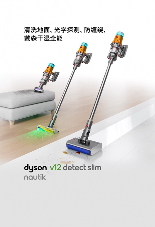 作為戴森推出的首款洗地吸塵器,戴森V12 Detect Slim Nautik在保留原先V12的可視化清潔、防纏繞技術(shù)等核心技術(shù)的前提下,加入了戴森Nautik洗地滾筒配件,集灰塵探測、防纏繞、清洗地面等功能于一體。根據(jù)官方推薦使用流程,是先用纖巧軟絨滾筒吸頭去進(jìn)行地板吸塵,通過吸頭上碳纖維材質(zhì)的靜電反應(yīng),能從地面吸除最細(xì)小的微塵,防止拖地時把地上的碎屑、過敏原等灰塵污染物推到其他地方,吸塵結(jié)束之后再加上Nautik洗地滾筒配件再進(jìn)行拖地清潔,確保地板能夠得到真正的清潔。