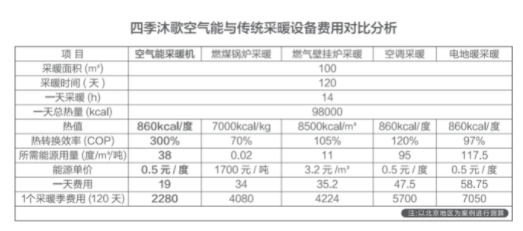 那么,四季沐歌空氣能具體耗電量如何?以100㎡三居戶型采暖為例,采暖4個月,每天運行14小時,在每天消耗熱量98000kcal的標(biāo)準(zhǔn)下,通過四季沐歌空氣能采暖每天只需消耗19元,為期4個月的采暖季共花費2280元,對比電采暖節(jié)省4770元,同時相比于燃煤鍋爐采暖、燃?xì)忮仩t采暖和空調(diào)采暖各節(jié)省約1800元、1944元、3420元。然而,其采暖效果卻遠(yuǎn)遠(yuǎn)優(yōu)于燃煤采暖、電暖氣以及空調(diào)采暖,這正是許多消費者選擇四季沐歌空氣能冷暖機的最重要原因之一。