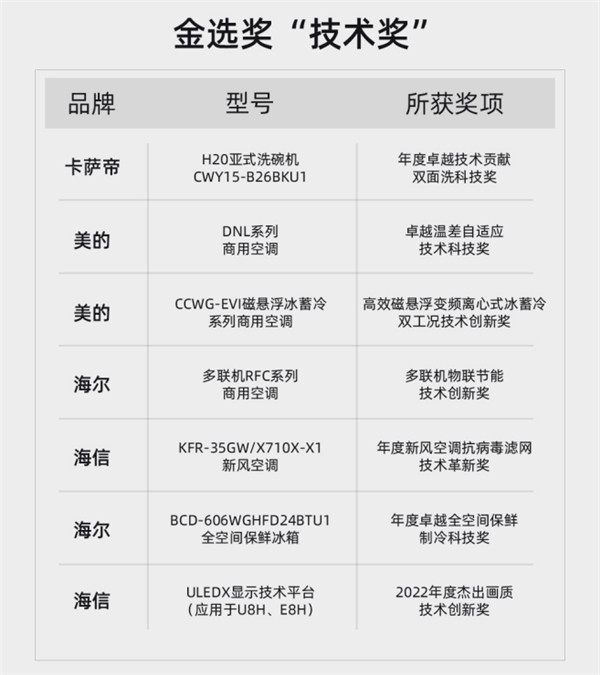 本次榮獲“金選獎”的品牌主要有卡薩帝、美的、海信、TCL、海爾、萊克、COLMO、碧云泉、Leader、吉米、萊小廚,產品涵蓋冰箱、電視、空調、中央空調、凈水機、洗碗機、洗地機、除螨儀、電飯煲等各大科技品類。(具體產品型號見文末附表)。
