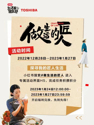 為了讓更多人了解和體驗匠人生活,小紅書和東芝還準備了東芝水波爐VD7000、東芝T16小書包波輪洗衣機、精控鮮旋風空氣炸鍋等匠心福利好禮。2023年1月27日前,在小紅書站內搜索話題#做生活的匠人進入活動H5頁面,完成任務,獲取積分,即有機會參與1月24日12點至1月27日24點的好禮兌換。