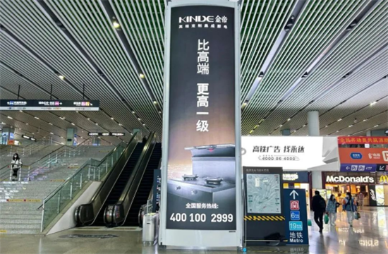 面對開年消費復(fù)蘇回暖的態(tài)勢和即將到來的315活動節(jié)點,金帝緊抓黃金傳播周期,提前在全國重點省會級、地市級城市核心高鐵樞紐深度布局,開啟高鐵品牌廣告霸屏模式,集中輸出“比高端|更高一級”的“高端定制集成廚電”戰(zhàn)略定位,全方位展示行業(yè)首款高端定制集成廚電產(chǎn)品——金帝G990ZK2的高顏值與產(chǎn)品力,搶先占領(lǐng)消費者心智,將品牌觸角延伸到全國各個角落。