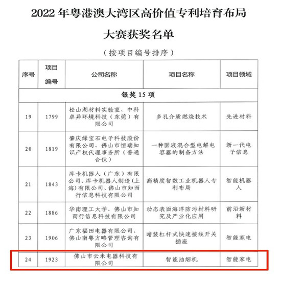 本屆“灣高賽”自今年4月啟動以來,吸引了含港澳地區(qū)在內(nèi)的全國各地企業(yè)、高校、科研院所、有重要發(fā)明創(chuàng)造的個人等創(chuàng)新主體的踴躍參賽,涵蓋了生物醫(yī)藥、人工智能、高端裝備制造、新材料、節(jié)能環(huán)保、新一代信息技術等多個領域。經(jīng)初賽、復賽、決賽環(huán)節(jié),最終評選出10項金獎、15項銀獎、25項優(yōu)秀獎。云米憑智能油煙機項目出色的科技、智能、創(chuàng)新優(yōu)勢,一舉獲得本屆“灣高賽”銀獎。本次獲獎,是對云米多年來不斷深化專利布局和加大技術創(chuàng)新投入的充分肯定。