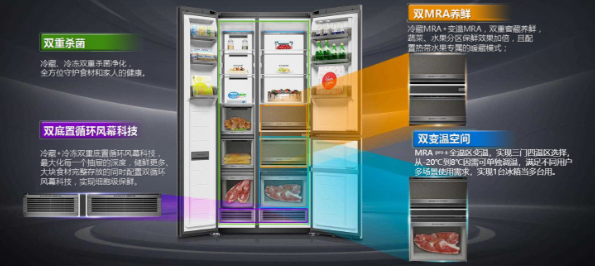 例如卡薩帝603L疊式對(duì)開(kāi)門(mén)冰箱首創(chuàng)雙重MRA空間,上層MRA低氧窖藏空間可以存放有機(jī)蔬菜,下層MRAPro變溫窖藏空間用來(lái)儲(chǔ)存四季水果,不會(huì)串味,也避免了細(xì)菌交叉感染等潛在隱患?瑟(dú)立控溫的雙重變溫空間,除了MRA Pro變溫窖藏空間,還有超寬幅變溫空間,從5℃冷藏到-20℃冷凍可靈活調(diào)控。夏天可以放心囤冷飲、水果,冬天也可以多采購(gòu)一些冷凍魚(yú)類(lèi)肉類(lèi),實(shí)現(xiàn)儲(chǔ)鮮自由。另外還有雙重底置循環(huán)風(fēng)幕科技設(shè)計(jì),為底層抽屜多釋放出了12.25L的容積,方便儲(chǔ)鮮大塊的羊腿、海魚(yú)等食材;冷藏、冷凍雙重殺菌凈化功能,可實(shí)時(shí)監(jiān)控并主動(dòng)感知食材存儲(chǔ)變化,實(shí)現(xiàn)99.999%殺菌凈化。