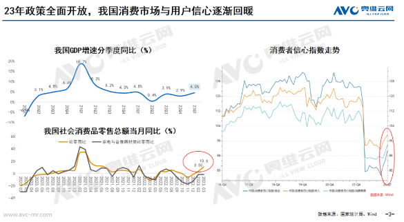 2023年隨著政策的全面開放,我國(guó)市場(chǎng)環(huán)境逐步回暖,今年一季度GDP同比增速提至4.5個(gè)百分點(diǎn),3月社零同比亦高達(dá)10.6%。同時(shí)我們也看到消費(fèi)者信心逐漸回暖之勢(shì)。(了解更多家電數(shù)據(jù),請(qǐng)點(diǎn)擊“奧維數(shù)據(jù)羅盤”)