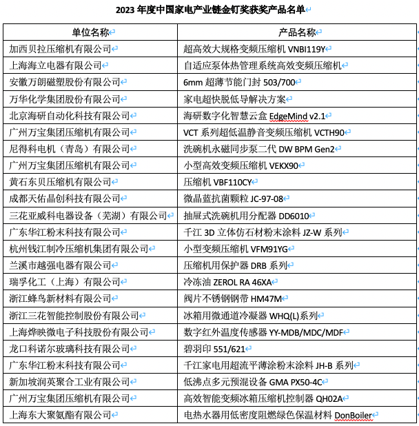 為表彰對(duì)提升家電整機(jī)性能、技術(shù)、功能等方面做出卓越貢獻(xiàn)的配套零部件生產(chǎn)企業(yè),2023年度中國(guó)家電產(chǎn)業(yè)鏈金釘獎(jiǎng)在本次會(huì)議的最后環(huán)節(jié)隆重揭曉。金釘獎(jiǎng)是中國(guó)家電產(chǎn)業(yè)鏈上游含金量最高的專(zhuān)業(yè)獎(jiǎng)項(xiàng),是對(duì)配套企業(yè)技術(shù)實(shí)力的最佳證明。
