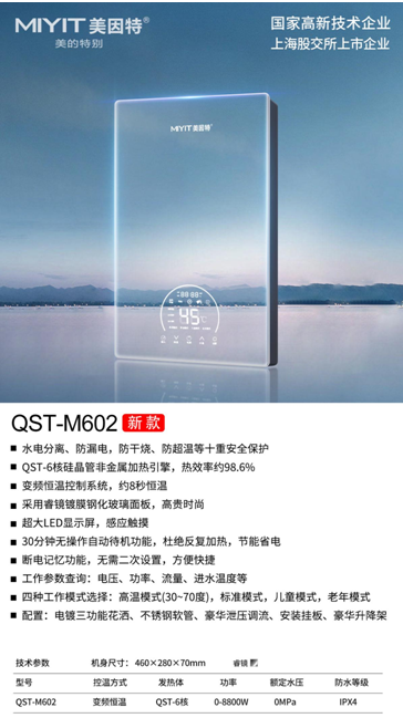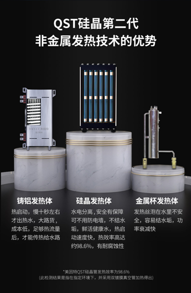 李衛(wèi)澤介紹,美因特也有采用鑄鋁發(fā)熱體的即熱產(chǎn)品,但是對于中高端的新品,美因特堅持應(yīng)用QST硅晶第二代非金屬發(fā)熱技術(shù)。