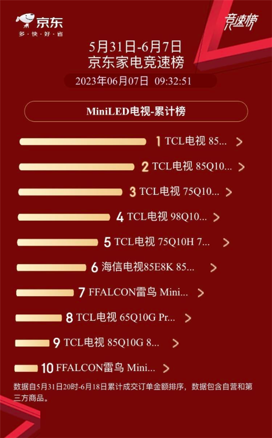 然后我就搜了一下京東今年618的Mini LED電視銷量排行榜,沒想到TCL竟然這么強(qiáng),排名前十的電視竟然有九款都是TCL的,這確實(shí)有點(diǎn)驚到我了。群眾的眼睛是雪亮的,大家都選擇的產(chǎn)品一定差不了,所以我也就選擇入手了銷量排名第一的TCL Q10G Pro。