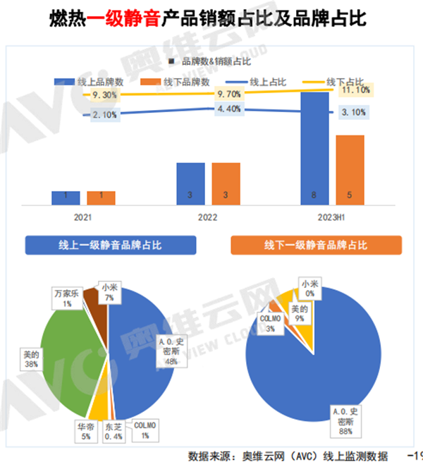 靜音同樣是主要趨勢之一。燃熱一級靜音的入局品牌顯著增多。一級靜音產(chǎn)品線上同比增加3.10%,線上品牌數(shù)同比增加11.1%,A.O.史密斯在靜音領(lǐng)域可謂是一家獨大,線上占比近五成,線下占比近九成。