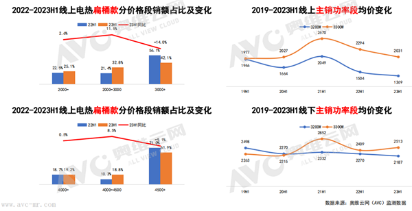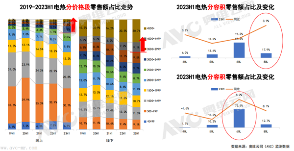 價格段方面,線上市場2000-2499元價格段和3500元以上價格段呈現(xiàn)增長趨勢;線下市場4000元以上價格增長顯著,其中,6000元以上價格段零售額占比達(dá)到19.1%。線上16L和18L均價同比增長5.2%和11.3%,助推價格提升。