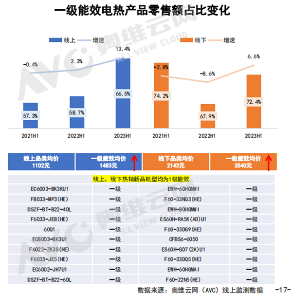 隨著“綠色低碳,節(jié)能環(huán)!钡睦砟钌钊肴诵模苄б渤蔀橄M者選購的重要因素之一。據(jù)奧維云網(wǎng)(AVC)數(shù)據(jù)顯示,電熱、燃熱一級能效占比均有所增長,一級能效電熱產(chǎn)品線上零售額占比66.5%,同步提升13.4%,均價提升至1483元,線下零售額占比72.4%,同步提升6.6%,均價提升至2540元。