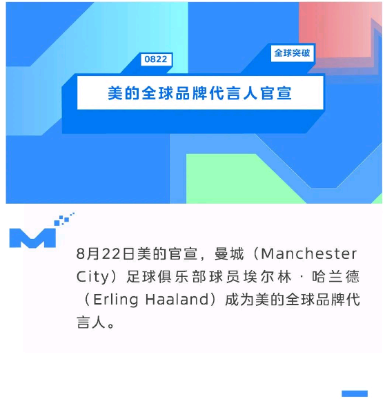 美的與曼城的成功合作始于2020年1月,本次哈蘭德官宣為美的全球品牌代言人是這一合作關(guān)系的最新延展。迄今為止,雙方合作的各類營銷活動屢獲殊榮,與之相伴的是與全球數(shù)億粉絲和球迷的深度互動。今年5月,美的宣布與曼城足球俱樂部續(xù)約全球官方合作伙伴,開啟雙方第四個合作周期。