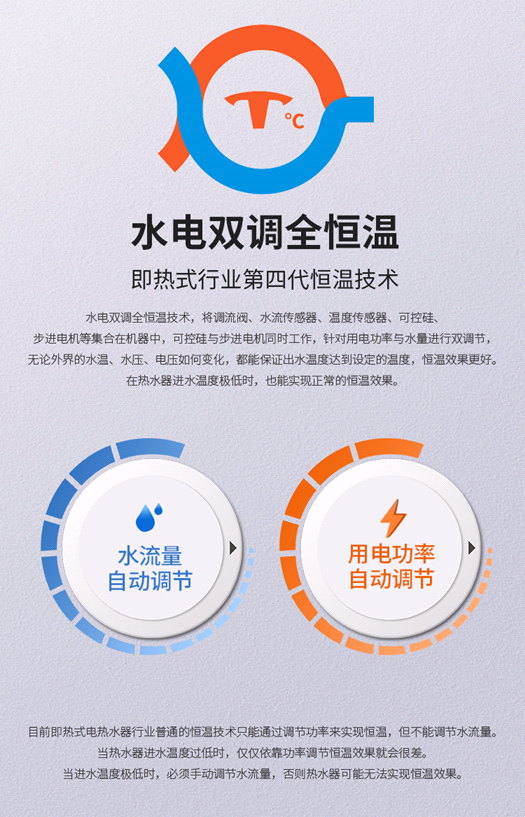 李衛(wèi)澤介紹,水電雙調(diào)全恒溫技術(shù),是指熱水器可以自動(dòng)調(diào)節(jié)用電功率,自動(dòng)調(diào)節(jié)用水流量,無(wú)論外界的水溫、水壓、電壓如何變化,都能保證出水溫度達(dá)到設(shè)定的溫度,恒溫效果更好。