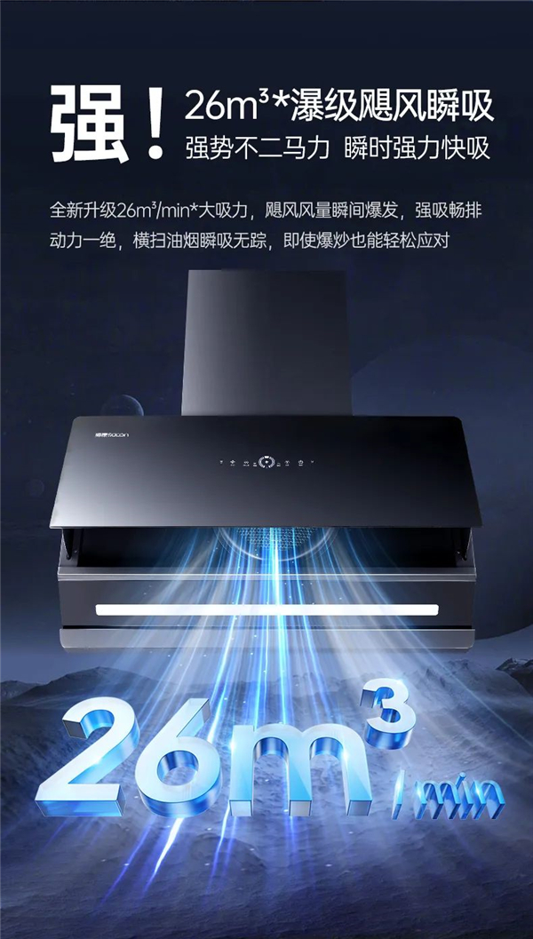 全新升級(jí)26m3/min*大吸力,颶風(fēng)風(fēng)量瞬間爆發(fā),強(qiáng)吸暢排動(dòng)力一絕,橫掃油煙瞬吸無蹤,即使爆炒也能輕松應(yīng)對(duì)。