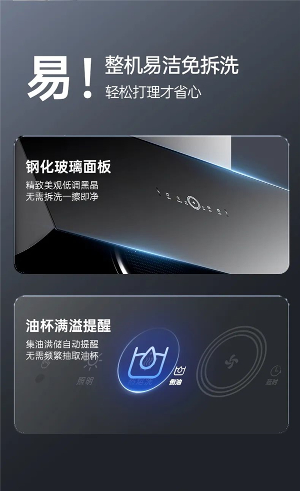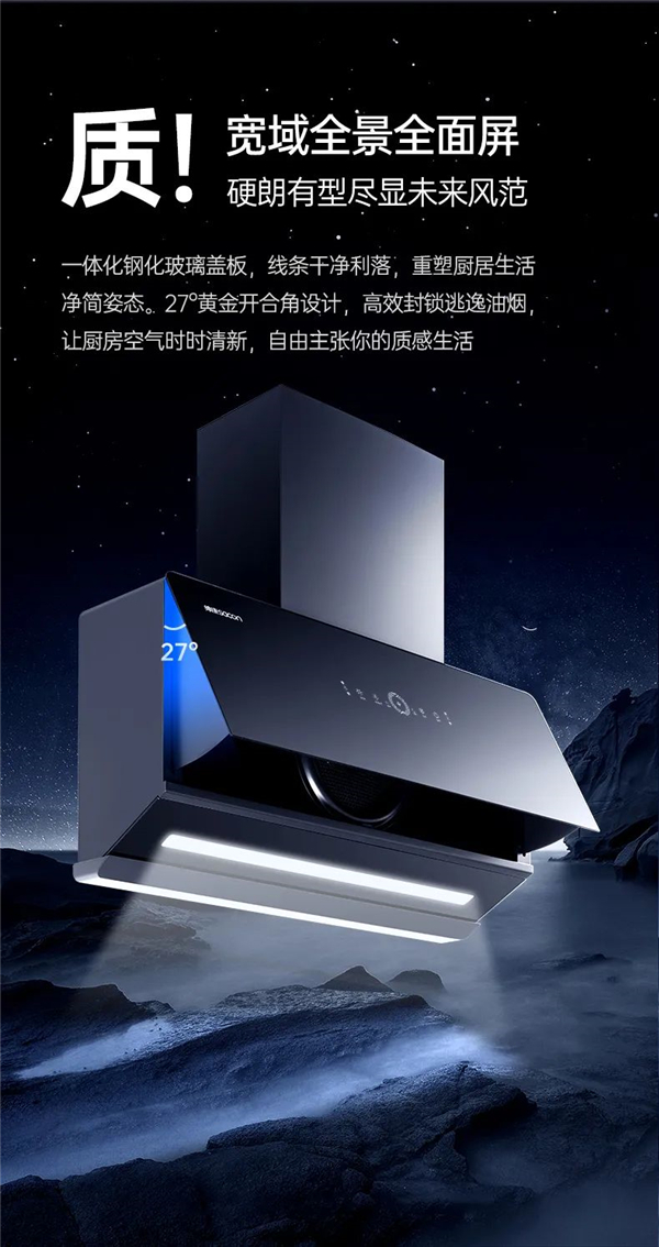 一體化鋼化玻璃蓋板,線條干凈利落,重塑廚居生活凈簡姿態(tài)。27°黃金開合角設(shè)計(jì),高效封鎖逃逸油煙,讓廚房空氣時(shí)時(shí)清新,自由主張你的質(zhì)感生活。