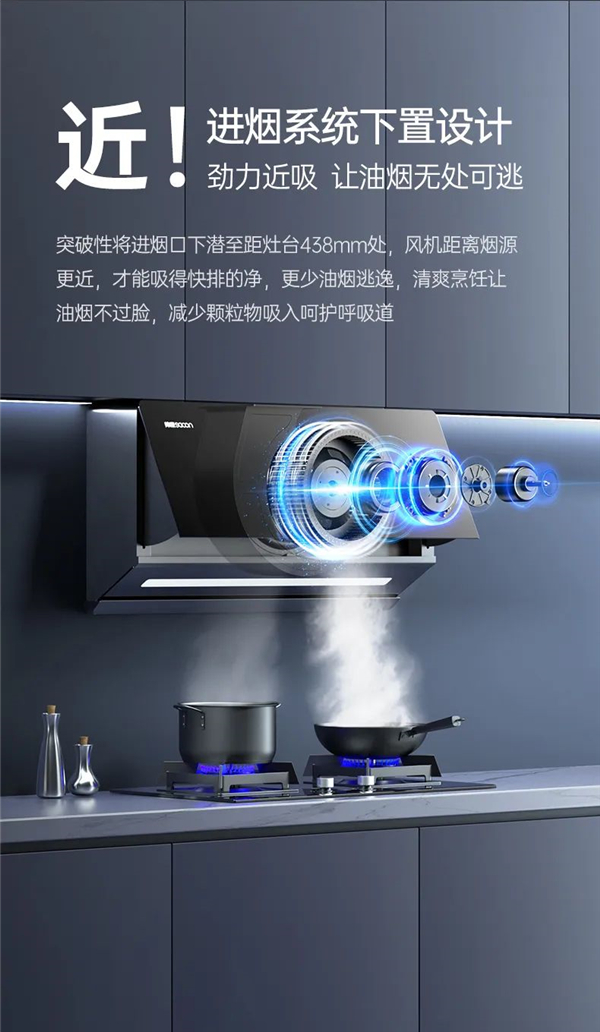 突破性將進(jìn)煙口下潛至距灶臺(tái)438mm處,風(fēng)機(jī)距離煙源更近,才能吸得快排的凈,更少油煙逃逸,清爽烹飪讓油煙不過臉,減少顆粒物吸入呵護(hù)呼吸道。