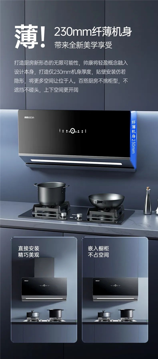 打造廚房新形態(tài)的無限可能性,帥康將輕盈概念融入設(shè)計(jì)本身,打造僅230mm機(jī)身厚度,貼壁安裝仿若隱形,將更多空間讓位于人。百搭廚房不挑柜型,不遮擋不碰頭,上下空間更開闊。