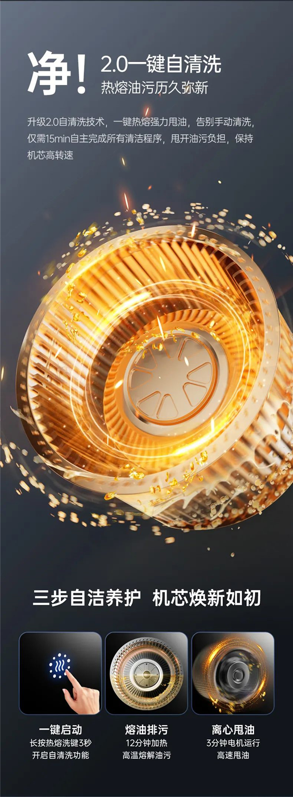 升級(jí)2.0自清洗技術(shù),一鍵熱熔強(qiáng)力甩油,告別手動(dòng)清洗僅需15min自主完成所有清潔程序,甩開油污負(fù)擔(dān),保持機(jī)芯高轉(zhuǎn)速。