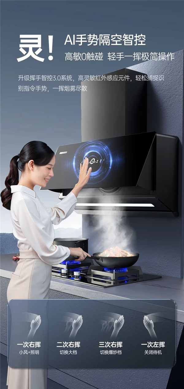 升級(jí)揮手智控3.0系統(tǒng),高靈敏紅外感應(yīng)元件,輕松捕捉識(shí)別指令手勢(shì),一揮煙霧盡散。