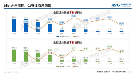 淄博燒烤的火爆出圈,“特種兵式旅游”刷屏網(wǎng)絡(luò),無一不彰顯著今年旅游市場的火爆,這種影響同時也表現(xiàn)在掛燙機(jī)市場上。據(jù)奧維云網(wǎng)(AVC)全渠道推總數(shù)據(jù),今年第二季度掛燙機(jī)零售額規(guī)模為6.9億元,同比上漲10個百分點;零售量規(guī)模367.1萬臺,同比上漲6.1%。到第三季度,市場有所降溫。今年第三季度掛燙機(jī)零售額規(guī)模為5.2億元,同比微跌0.8個百分點;零售量規(guī)模287.8萬臺,同比上漲4.0%。分月度來看,7月、8月仍然有明顯上漲。到了9月,由于部分消費在前期“旅游熱”下提前釋放,數(shù)據(jù)有一定下滑。