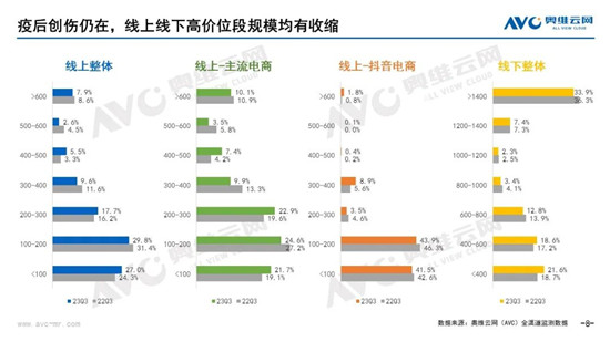 疫情雖然結(jié)束,但帶來的創(chuàng)傷猶在。三年抗疫直接影響到居民的收入水平和消費水平,不可避免的出現(xiàn)了消費降級趨勢。奧維云網(wǎng)(AVC)監(jiān)測數(shù)據(jù)顯示,從掛燙機(jī)線上整體的價格段分布來看,低于100元的產(chǎn)品零售額占比為27.0%,漲幅為2.7%;線下也表現(xiàn)出類似特征,400元以下的產(chǎn)品零售額占比為21.6%,增幅為2.9%。無論是線上還是線下,較高價位段的規(guī)模都出現(xiàn)了收縮。戳→奧維數(shù)據(jù)羅盤