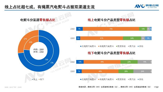 線上仍然是電熨斗的主要銷售渠道。奧維云網(wǎng)全渠道(AVC)推總數(shù)據(jù)顯示,2023年Q3,電熨斗線上渠道零售額占比為73%,對比去年同期略有下滑。從產(chǎn)品類型分布來看,有繩蒸汽電熨斗占據(jù)線上、線下雙渠道主流。據(jù)奧維云網(wǎng)全渠道(AVC)監(jiān)測數(shù)據(jù),2023年Q3線上渠道中有繩蒸汽電熨斗的零售額占比為75%,同比有明顯提升;線下渠道中,有繩蒸汽電熨斗的零售額占比為49%,占比也達(dá)到了近一半。戳→奧維數(shù)據(jù)羅盤