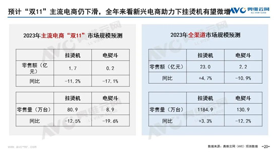 全年來看,新興電商助力下,掛燙機(jī)有望實現(xiàn)微增長。奧維云網(wǎng)(AVC)預(yù)測數(shù)據(jù)顯示,2023年全渠道掛燙機(jī)零售額規(guī)模為23.0億元,同比上漲4.7%。零售量規(guī)模為1184.9萬臺,同比上漲3.3%;電熨斗零售額規(guī)模為2.2億元,同比下滑10.9%。零售量規(guī)模為130.9萬臺,同比下滑12.2%。