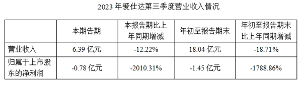 愛仕達(dá)發(fā)布2023年三季報,前三季度實現(xiàn)營業(yè)收入18.04億元,同比下滑18.71%;實現(xiàn)歸母凈利潤-1.45億元,同比下滑1788.86%。單三季度實現(xiàn)營業(yè)收入6.39億元,同比下降12.22%;實現(xiàn)歸母凈利潤-7784.45萬元,同比下滑2010.31%。