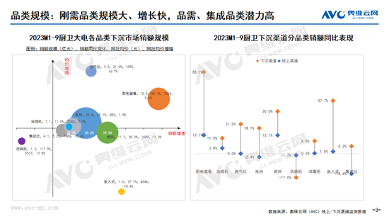 相較于剛需廚電,品需廚電在下沉市場的表現(xiàn)則稍遜一籌,品類的教育和滲透亟待加強。據(jù)奧維云網(wǎng)(AVC)下沉渠道監(jiān)測數(shù)據(jù)顯示,2023年1-9月,洗碗機、嵌入式、消毒柜銷額規(guī)模分別為1.3億元、1.0億元、1.0億元,同比增速分別為-17.0%、37.7%、8.9%;其中,洗碗機是廚衛(wèi)行業(yè)中唯一下降的品類。今年以來,國家和地方發(fā)布多項支持綠色智能家電下鄉(xiāng)的相關政策,在政策利好的背景下,企業(yè)應抓住下沉用戶熟人經(jīng)濟和從眾心理的消費特征,精準施策,擴大品牌影響力、提升消費者品類認知。