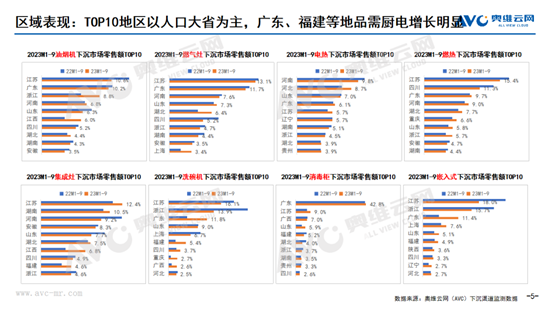 下沉市場TOP10地區(qū)以人口大省為主。據(jù)奧維云網(wǎng)(AVC)下沉監(jiān)測數(shù)據(jù)顯示,2023年1-9月煙、灶、電熱、燃熱規(guī)模TOP10區(qū)域中,江蘇、浙江、廣東、河南、山東、安徽、四川等地區(qū)高度重合,均為鄉(xiāng)村戶數(shù)排名靠前的區(qū)域。
