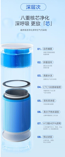 這款星澈空氣凈化器最大吸睛的賣點在于,搭載巨量凈化技術(shù),1分鐘凈化10833L空氣,可實現(xiàn)78㎡大空間凈化,讓用戶輕松煥新整屋空氣。同時具備8重核心凈化系統(tǒng),通過5重凈化濾芯,有效濾菌除醛,H13高等級HEPA,可對0.1微米顆粒物去除率高達(dá)99.9%。它還能針對室內(nèi)甲醛,采用納米凝膠分解除醛技術(shù),是美的與中山大學(xué)黃海保教授聯(lián)合研發(fā)的國家級項目成果,該技術(shù)可快速將甲醛分解為二氧化碳和水,除醛更徹底,更好的呵護寶寶健康呼吸。并且全新升級4大傳感器,AI智能巡航,能夠精準(zhǔn)監(jiān)測室內(nèi)空氣質(zhì)量,并且能智能顯示PM2.5/VOC/溫度/濕度,讓用戶一目了然,更好的掌控室內(nèi)空氣環(huán)境。