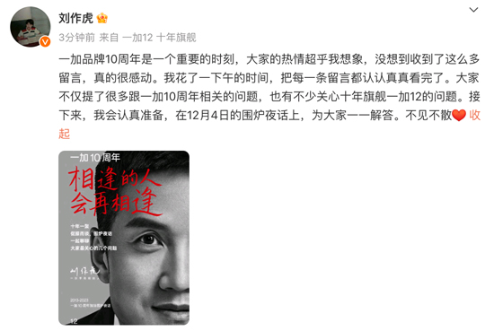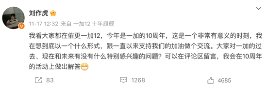 早在11月17日中午,一加創(chuàng)始人劉作虎就通過社交平臺向網(wǎng)友發(fā)起十周年問題征集,引起廣大網(wǎng)友積極參與留言。