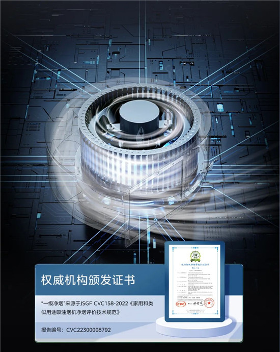 美的無煙感集成灶搭載鏡像直排風道,并通過6重油煙分離凈煙設計,打造遠超權威認證水準的凈煙效果。在24m³/min大風量和1080Pa變頻強壓下,智能感應暢快吸排油煙,讓烹飪時呼吸區(qū)域的PM2.5濃度下降到50μg/m³。經認證,搭載凈煙科技的多款美的無煙感油煙機“符合JSGF CVC158-2022《家用和類似用途吸油煙機凈煙評價技術規(guī)范》的要求。