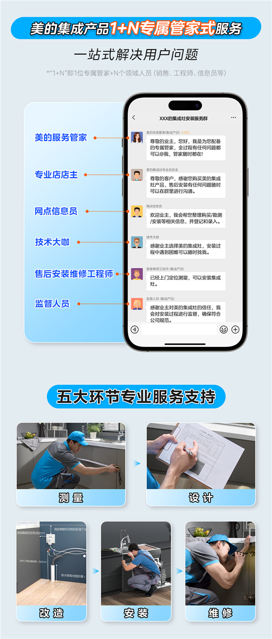 美的集成灶推出“1+N”專屬管家式服務,從勘察、購買到安裝,1V1專屬群對接,1位專屬管家+N個領域(銷售、工程師等)人員高效協(xié)同、24H響應服務、實時了解安裝進度、全流程可視;隨時解答售后疑問、快速溝通;提供高效協(xié)同、快速溝通、專業(yè)監(jiān)理的一站式服務。