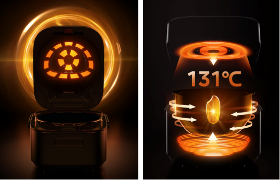 相較于傳統(tǒng)電飯煲底盤(pán)加熱以及其產(chǎn)生的米飯上下受熱不均、底部干硬、結(jié)塊的問(wèn)題,美的赤炎臻香電飯煲采用IH加熱與包裹式加熱結(jié)合的方式,通過(guò)頂部IH 500W加熱搭配底部IH 1300W的大功率加熱形成熱對(duì)流,美的赤炎臻香電飯煲可使米飯?jiān)谡糁筮^(guò)程中淀粉轉(zhuǎn)化更加均勻;蓋板內(nèi)置赤炎板131度超沸點(diǎn)高溫,通過(guò)其產(chǎn)生的高溫蒸汽對(duì)米飯進(jìn)行二次補(bǔ)炊,并激發(fā)美拉德反應(yīng)更大程度釋放米飯自身的噴香味道。