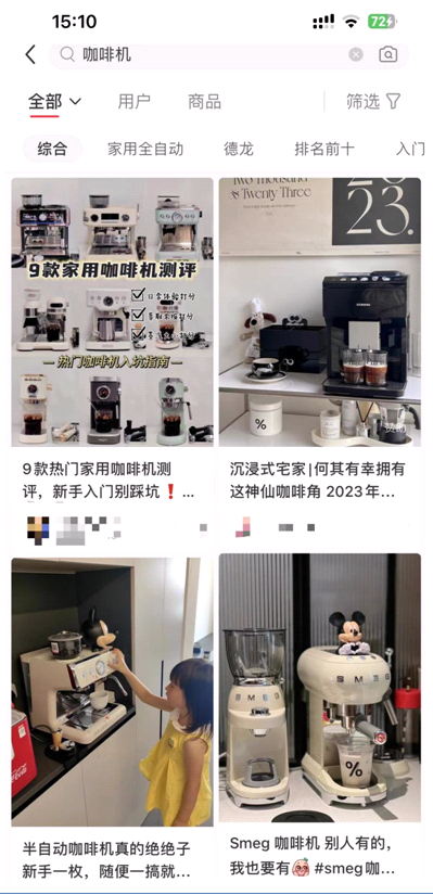 在小紅書上搜索“咖啡機”能夠獲得近90萬篇筆記,超2萬件商品,各種咖啡機選購、家庭咖啡空間打造、在家用咖啡機DIY咖啡飲品各種分享比比皆是。其中不乏有知名海外產(chǎn)品,也有像美的、東菱、蘇泊爾、小熊、米家等家電品牌推出了咖啡機產(chǎn)品,咖啡機在中國這片沃土上生根發(fā)芽。