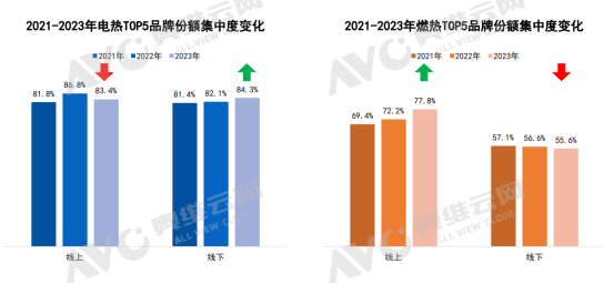 隨著市場品質(zhì)化的發(fā)展,競爭也日趨激烈。品牌集中度的變化也反映出這一點(diǎn)。根據(jù)奧維云網(wǎng)(AVC)的數(shù)據(jù),電熱線上和燃熱線下的市場份額排名前五的品牌呈現(xiàn)小幅下滑趨勢,而一些中腰部品牌的市場份額則有所增長。