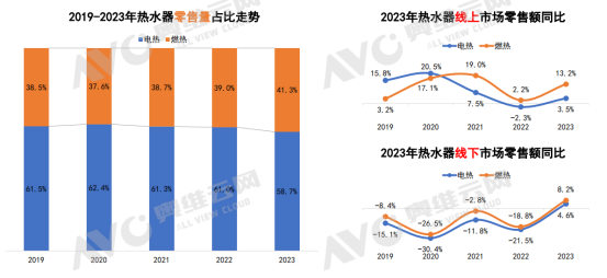 據(jù)奧維云網(wǎng)數(shù)據(jù)顯示,2023年電熱零售量占比58.7%,燃熱占比41.3%,兩者相差數(shù)額正在逐年縮小。相比之下,電熱水器市場目前主要以替換舊設(shè)備為主,更加側(cè)重于款式和參數(shù)的升級。燃?xì)鉄崴魇袌稣幱谠鲩L期,正在向高端和舒適化方向發(fā)展,吸引了越來越多的用戶。
