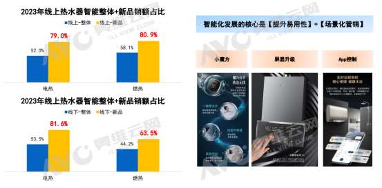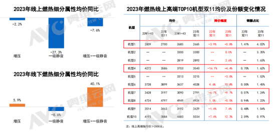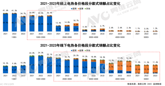 鑒于消費(fèi)者越來越重視家居空間的利用率、美觀度,熱水器整體的產(chǎn)品趨勢方向,呈現(xiàn)差異化賣點(diǎn)的“普及化”,具體表現(xiàn)為增壓和一級靜音等體驗(yàn)型功能均價大幅下滑,功能的疊加更嚴(yán)重的價格“內(nèi)卷”。燃熱一級靜音功能的產(chǎn)品線上均價同比下滑27.3%,線下均價同比下滑8.6%;線上靜壓+一級靜音功能的產(chǎn)品均價同比下滑7.6%。一方面,需警惕市場面臨產(chǎn)品同質(zhì)化的風(fēng)險,另一方面,高端產(chǎn)品的放價也促進(jìn)了產(chǎn)品份額的增長,不僅是品牌的增長機(jī)會,也有效促進(jìn)了行業(yè)高端化。