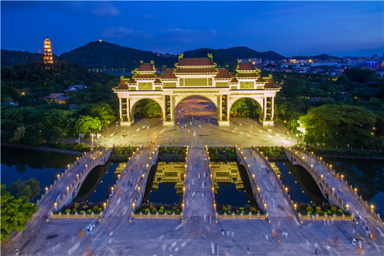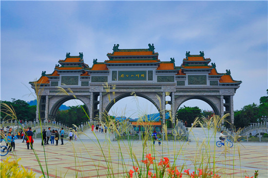 在順峰山公園北入口,跨過五行橋,便來到了公園標志性建筑——石牌坊。這座享有“中華第一牌坊”美譽的三跨拱結構牌坊,由2萬余塊巖石鑲嵌而成,總高度達37.6米,四個基座上的16條浮龍掛落在石柱上,凌空而下,氣勢恢宏。
