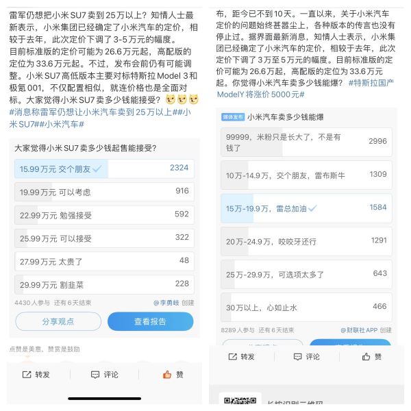 而我本人則參與了價格調(diào)查,在一個自媒體平臺上發(fā)出的投票,主題是,大家覺得小米SU7賣多少錢起售能夠接受?