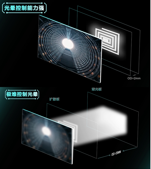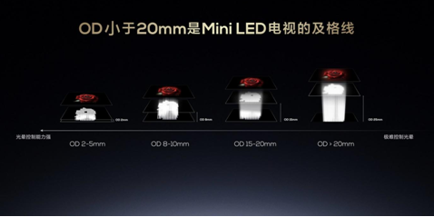 我們都知道當光傳播的距離越遠時其擴散角度就越大,同理,對于Mini LED電視來說,OD值越大,光線擴散角度就越大,在同樣分區(qū)數(shù)量下,就更容易溢出分區(qū)范圍,進而產生光暈現(xiàn)象,影響畫質表現(xiàn),同時過大的OD值也會讓電視變厚。按業(yè)界標準,Mini LED電視的OD小于20mm是及格線,OD值越小,光暈控制能力越強,電視越薄。